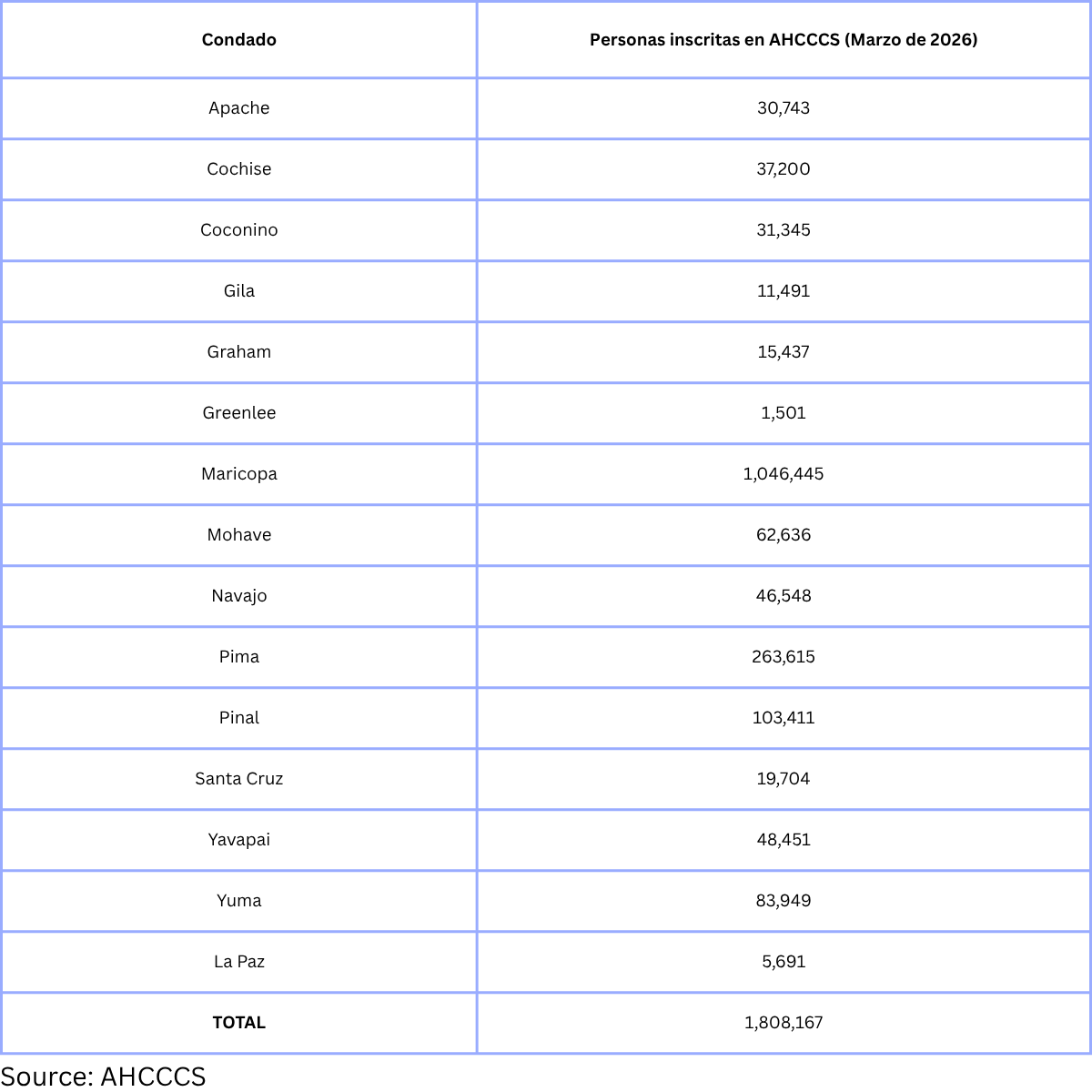 Estos recortes podrían tener consecuencias graves para los 1.8 millones de personas en Arizona que reciben cobertura a través de AHCCCS, el programa Medicaid del estado, en todos los condados del estado: